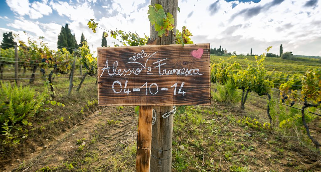 With Alessio and Francesca we chose as a location the vineyards of the Estate of Capezzana in Carmignano. Led by the father of the bride, we found a very special place called Il Versò (The Verso’). It is a small laurel grove with a round table stone in the middle, and a circular seat where in times long past the “braid” was made by local women, during the summer time.